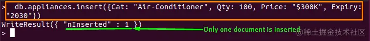 插入一个文档。 这种方法允许你在一个集合中一次只插入一个文档。这个具体方法的语法如下。