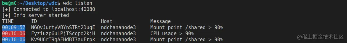 WDC监听一个远程警报服务器,该服务器广播警报信息。收到的警报将被记录到用户的主目录中的WDC/logs/ 。它还配备了一个监听8080端口的本地http服务器,有一个端点/{id} ,可以用来获取警报的细节,给定它的ID。同样可以通过命令行使用wdc的inspect 命令来完成。