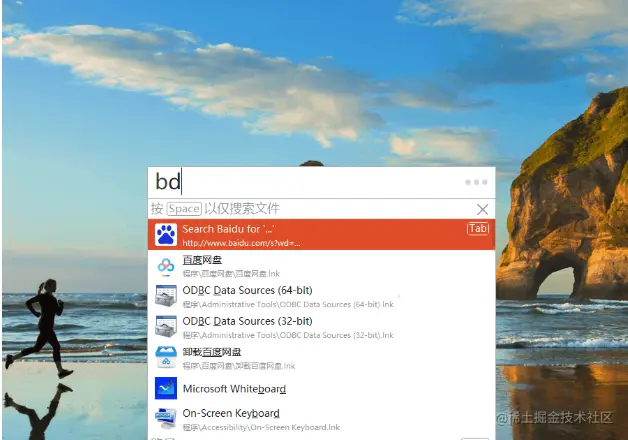 Listary在互联网关键词上的检索性能更强悍。双击Ctrl调出搜索框后,输入「bd+空格+关键词+Enter」,就能在某度里查找关键词内容。