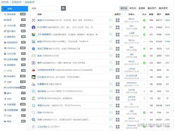 动作库中所包含的功能类型有:查询搜索、翻译、文本处理、图片操作、编程相关、剪切板相关、文件处理、快捷键、OCR、组合操作、功能、脚本、资源管理器......等20个分类