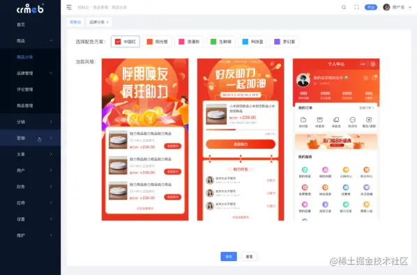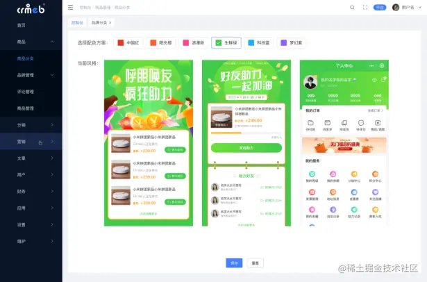 增加天空蓝、生鲜绿、热情红、魅力粉和活力橙 5 种商城主题颜色风格,匹配不同类型商城风格需求,可以选择适合的主题风格进行一键生成,各种角色转换方便快捷。