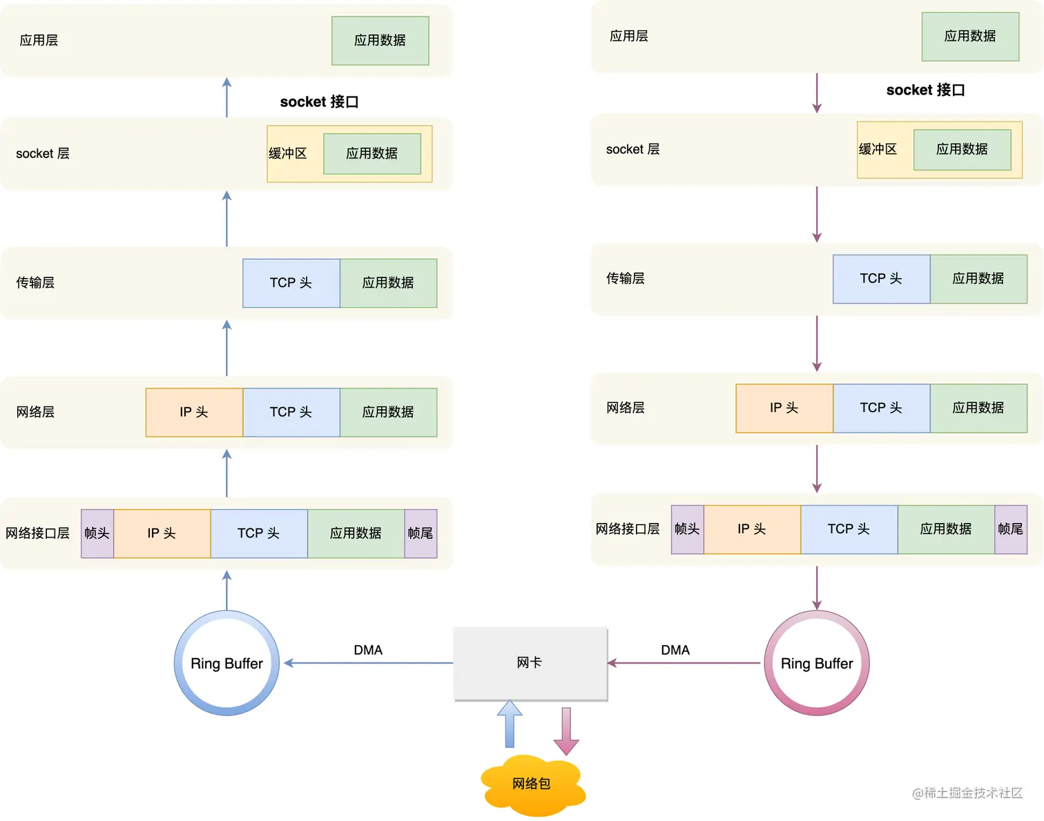 接下来,网络协议栈从 Socket 发送缓冲区中取出数据包,并按照 TCP/IP 协议栈从上到下逐层处理。