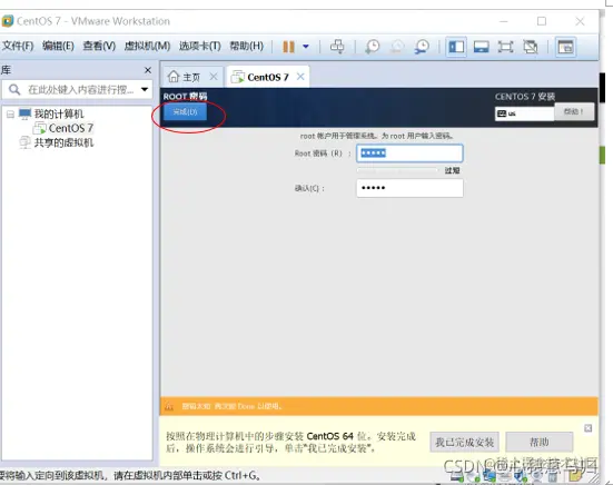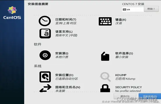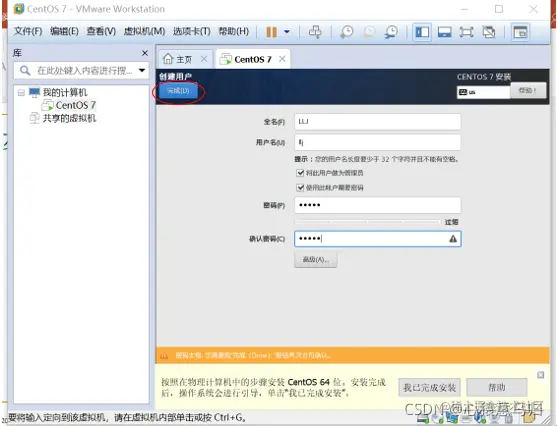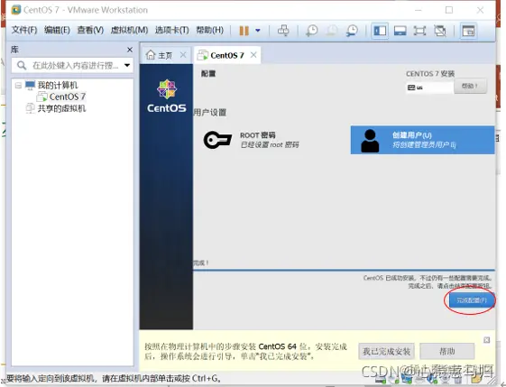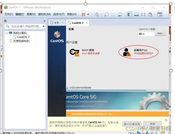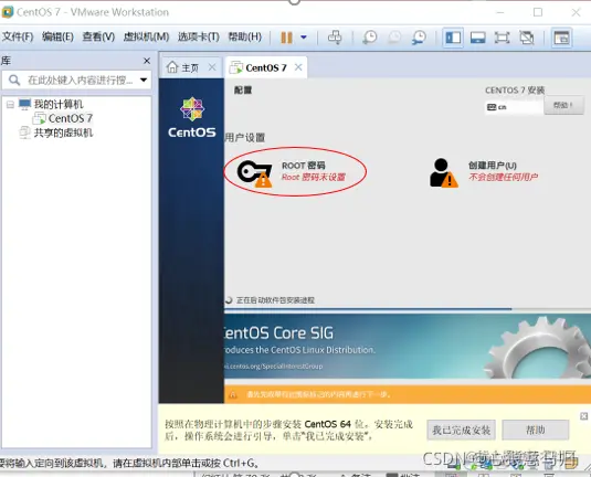(6)回到安装信息界面,单击“开始安装”,在安装过程中“设置root密码”和“创建新用户”。如图