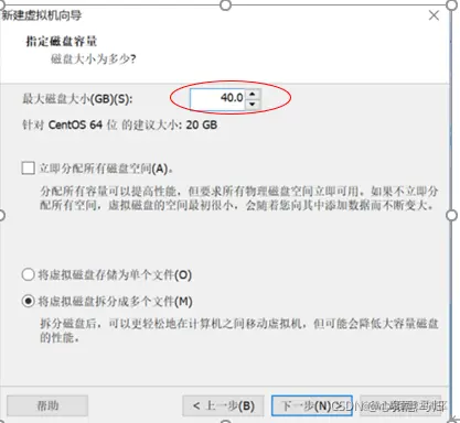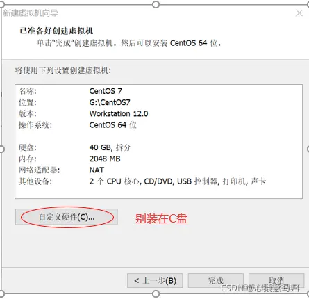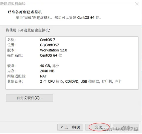 (10)选择“创 建新虚拟磁盘”,设置磁盘大小为 40GB,指定磁盘文件,自定义硬件,点击“下一步”按钮,完成 虚拟机的创建,如图