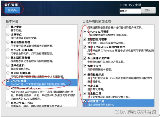(3)在安装信息界面,单击“软件选择”,弹出界面中勾选“GNOME”,将右边的选项全部勾选,最后点”完成“,如图