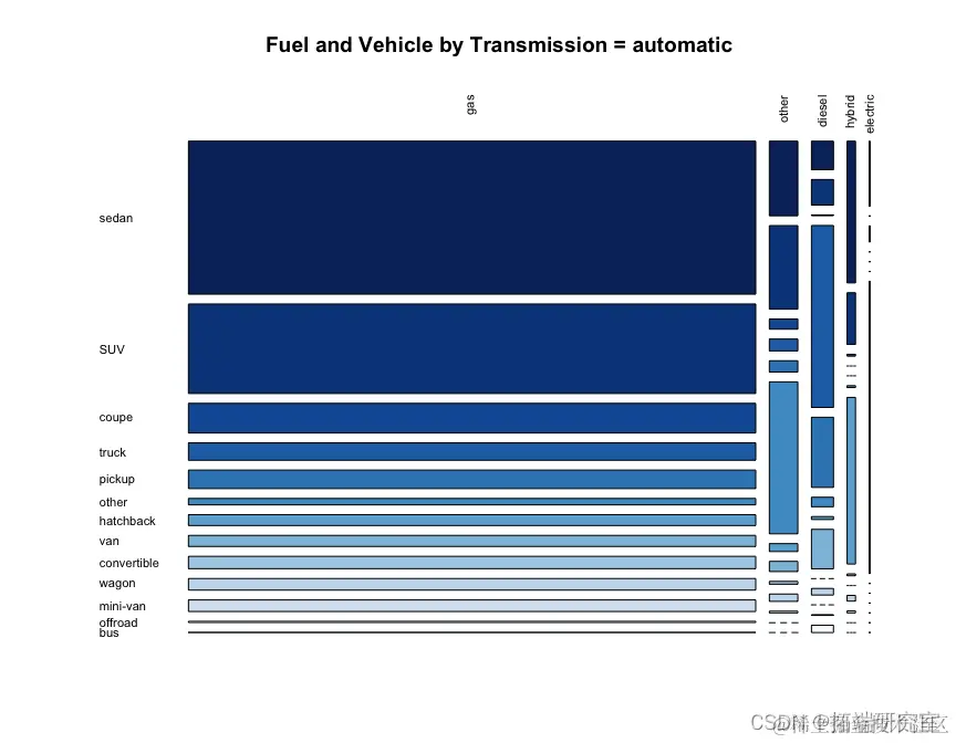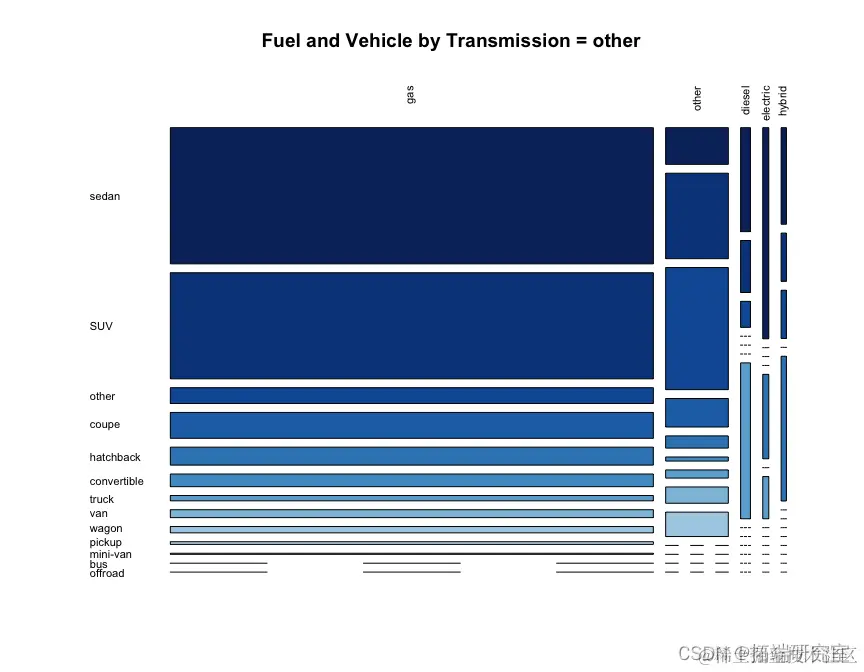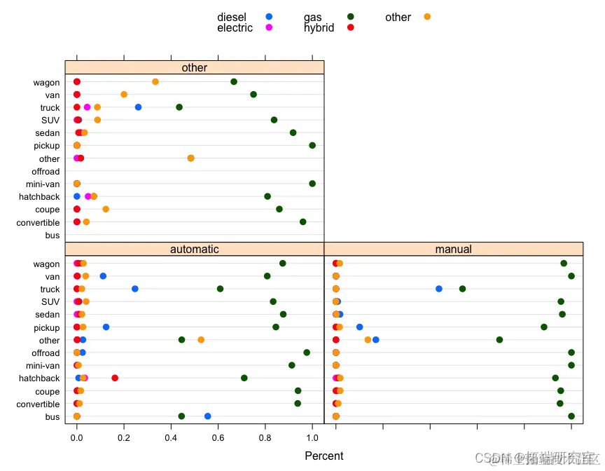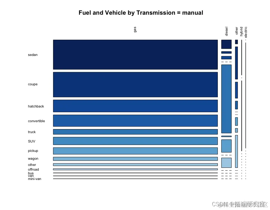 我们看到自动档 fuel == "gas"在所有类型的汽车中最常见,其次是手动。在后轮驱动车辆中,手动档比例确实高于轿跑车和敞篷车的其他车型,这是有道理的,因为轿跑车和敞篷车往往是跑车。在四轮驱动中,越野车比例更高。