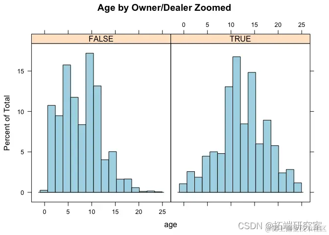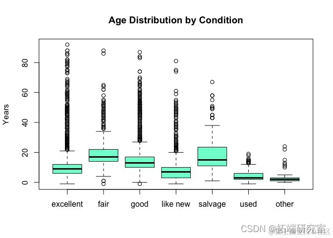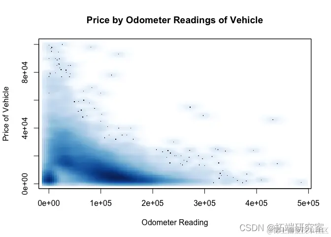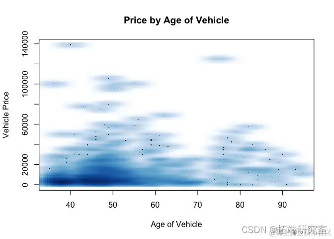 从下面的第一个 smoothScatter 图中,超过 35 年的汽车是“老爷车”。