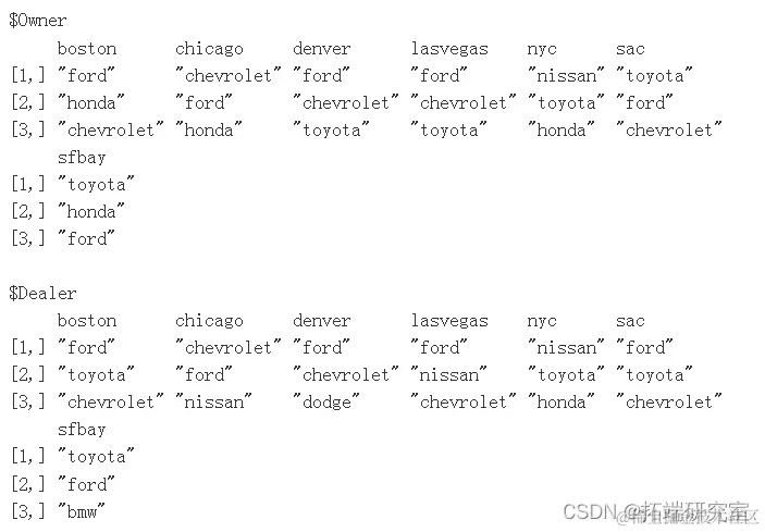 names(makeByCityByOwner) = c("Owner", "Dealer")