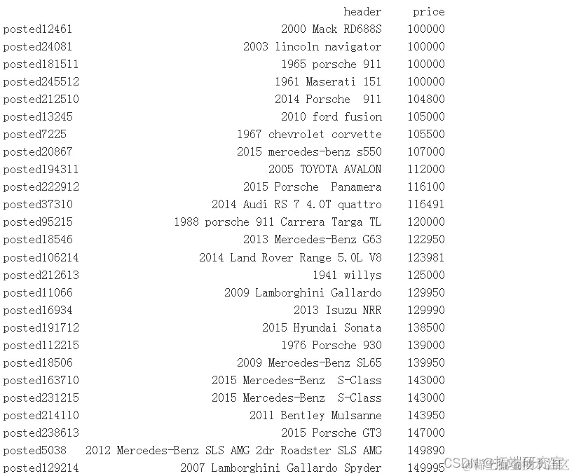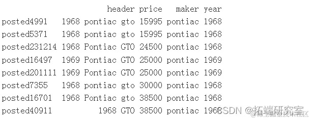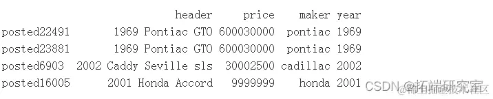 价格为 600030000 的两条记录是 1968 年和 1969 年的 Pontiac GTO - 600030000 美元,从阅读帖子正文可以看出,这些记录是在 6,000 美元到 30,000 美元之间定制 GTO 的报价。