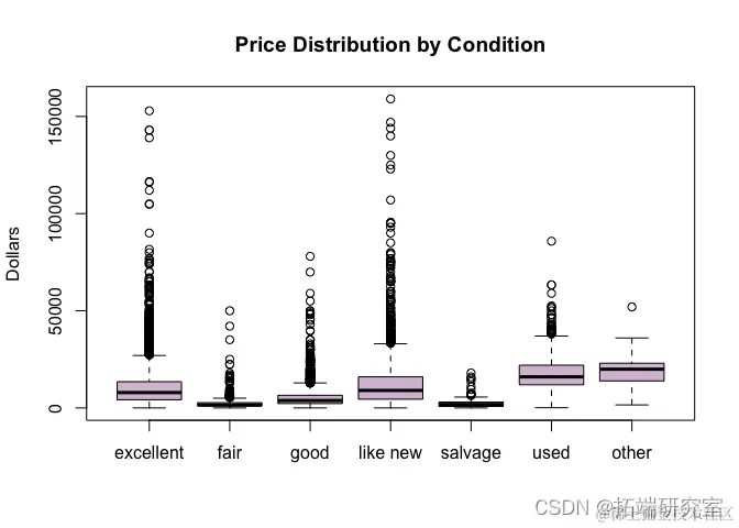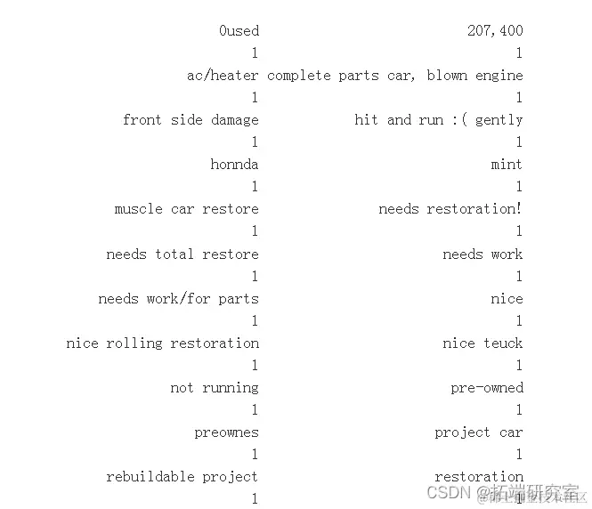 也有很多汽车以 1 元的价格出售。这是以最低价格发布的常见广告策略,因为大多数人将价格从最低到最高排序,因此这些广告更频繁地出现在顶部。其中大部分是经销商的误导性广告,一些是汽车零部件,一些是汽车融资的报价。这里有太多数据需要手动清理,所以我们将它们排除在外。