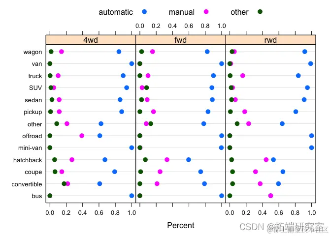dotplot( table(vpossts$drive, vposransmission, vpo$type))