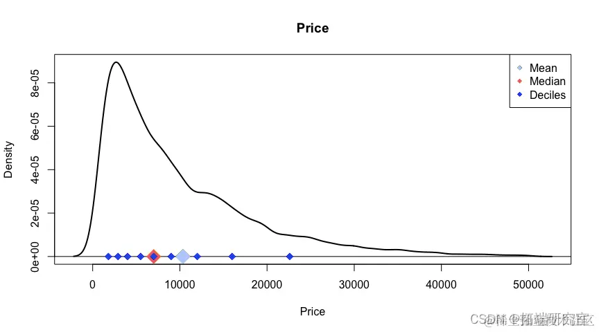 Question #3 What is the average price of all the vehicles? the median price? and the deciles? Displays these on a plot of the distribution of vehicle prices.