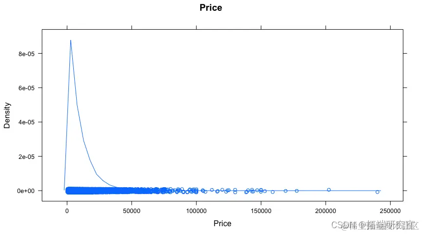 比较“老爷车”与所有汽车的价格分布,“老爷车”似乎密度更高,价格更高,大部分价格低于 40,000 美元,而整体数据的大部分往往低于 20,000 美元。