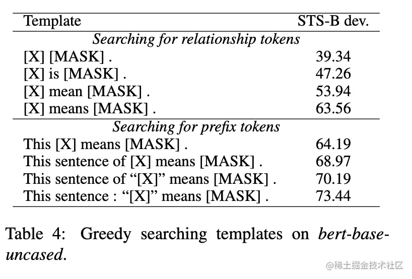 - 设计一种模板 "[X] means [MASK]" 其中 [X] 是我们输入的句子,然后将填充后模板塞进行一个预训练完的模型(如BERT),得到最终[MASK]表示,即当前句子的向量表示。如下公式所示: