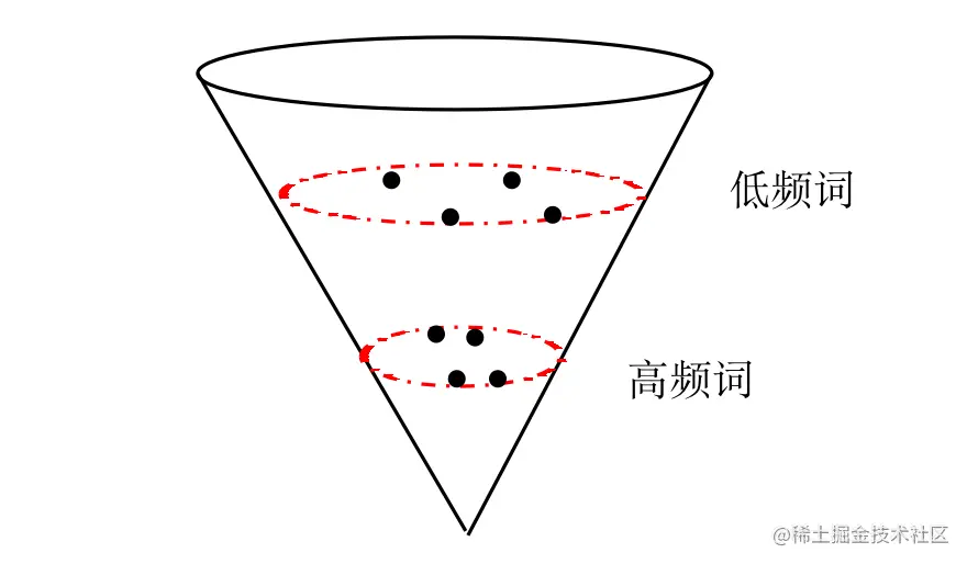 - 低频词离原点远,分布稀疏,高频词向量离原点近,分布紧密。