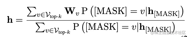 - 基于上述1得到,然后使用MLM任务的分类头,得到top-k个token的概率值,接着从embedding矩阵中取出这些词的向量进行加权平均。具体计算如下: