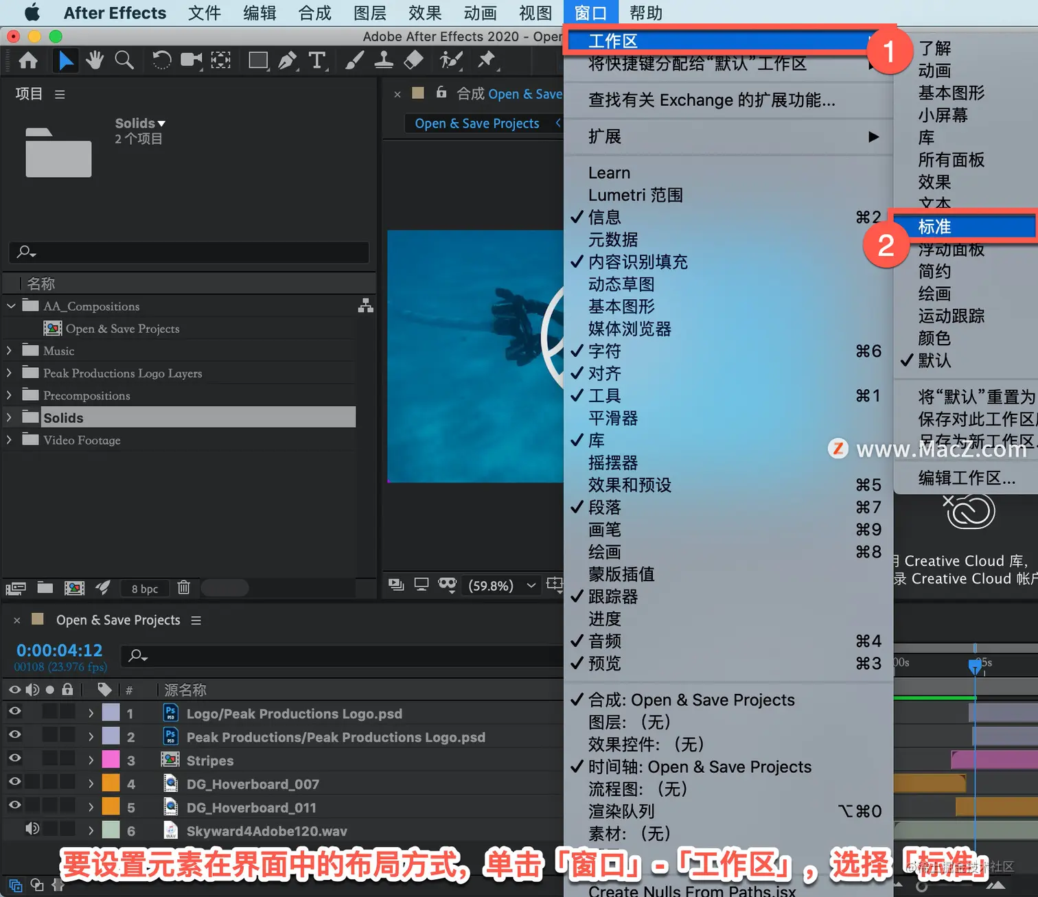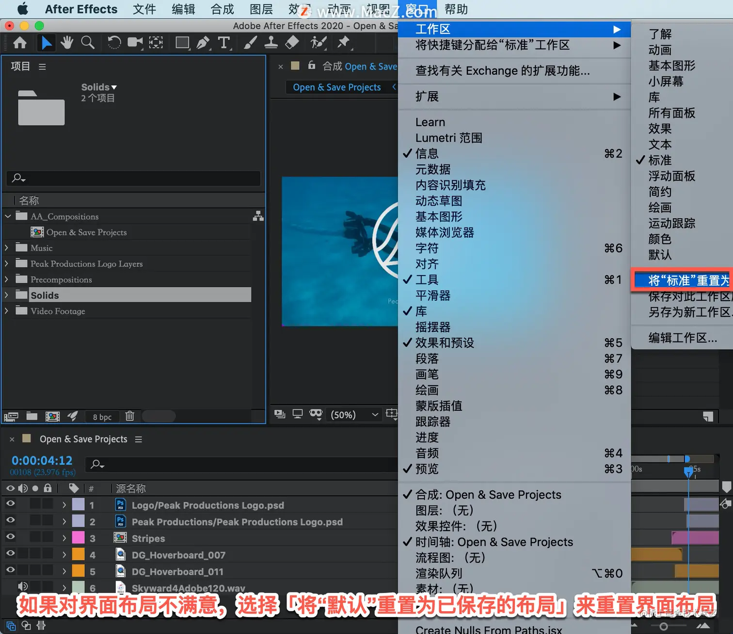 选择「标准」工作区,如果对界面布局不满意,选择「将“默认”重置为已保存的布局」来重置界面布局。