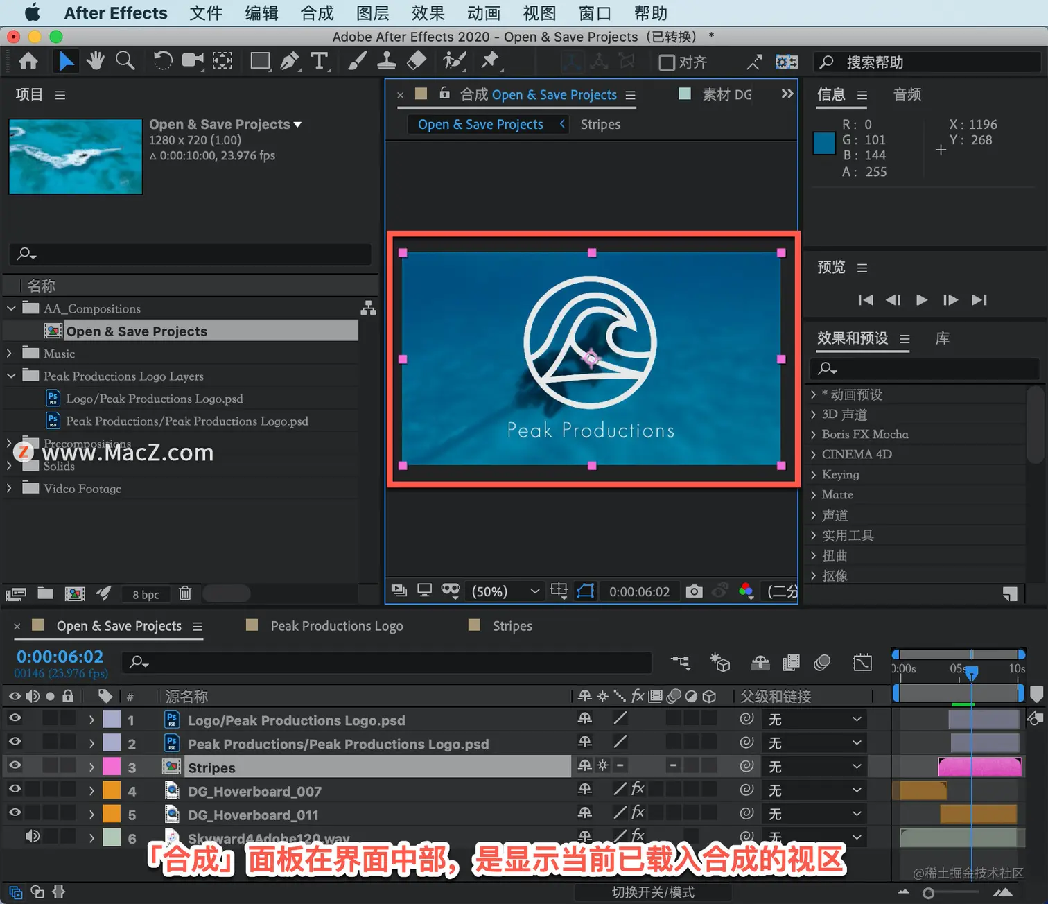 「合成」面板在界面中部,是显示当前已载入合成的视区。 合成包含时间轴中的一个或以上视频和/或图形元素叠状图层。