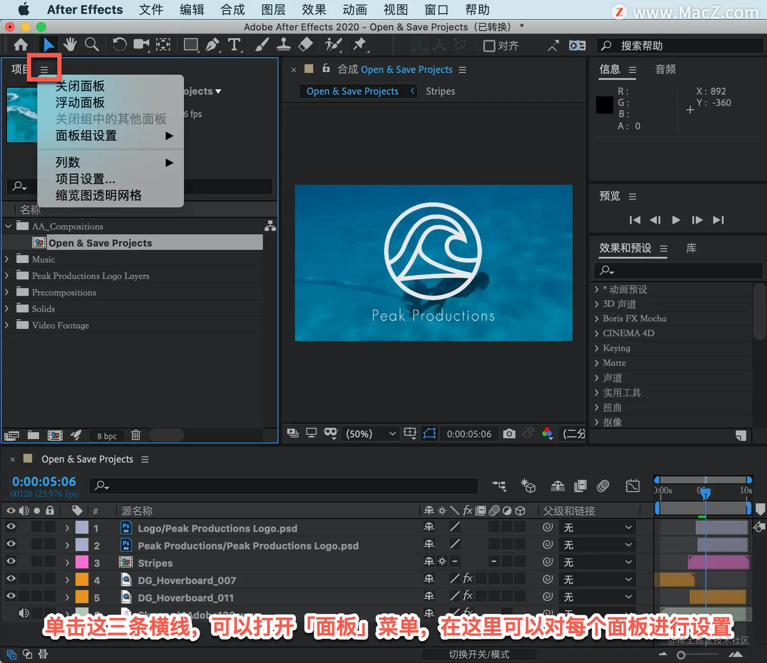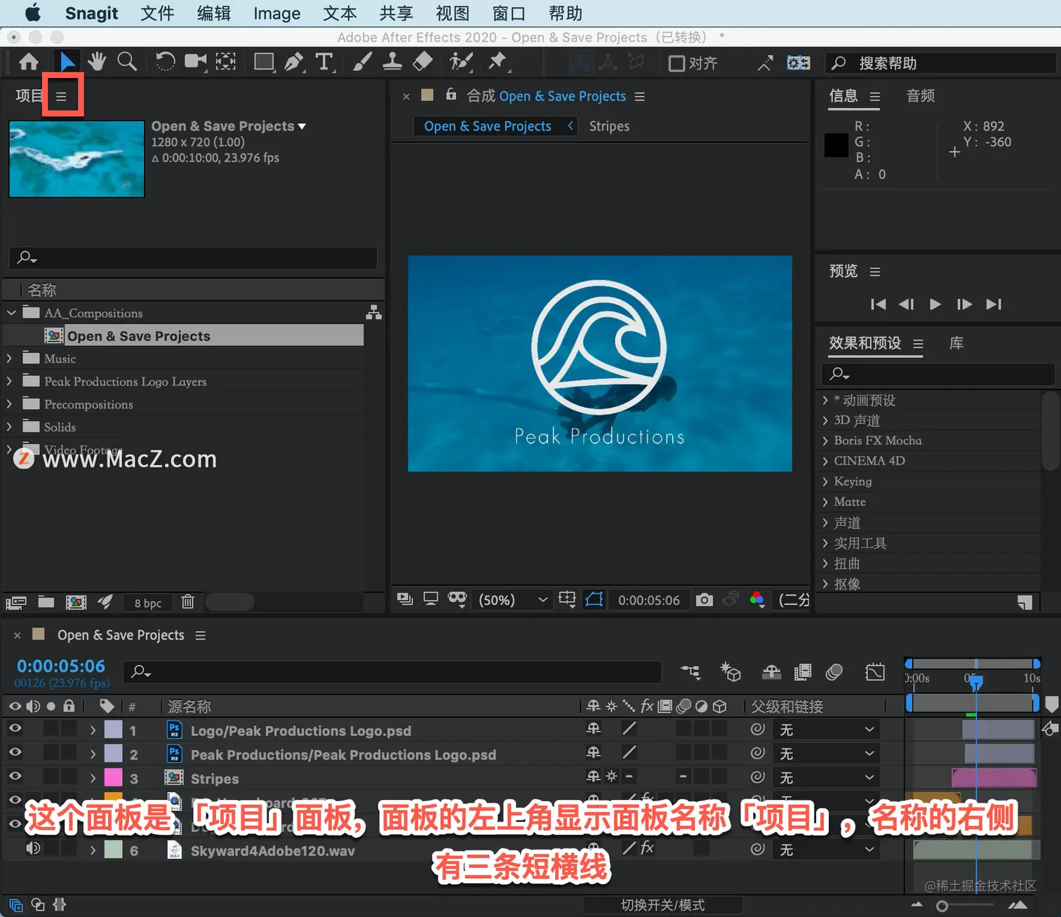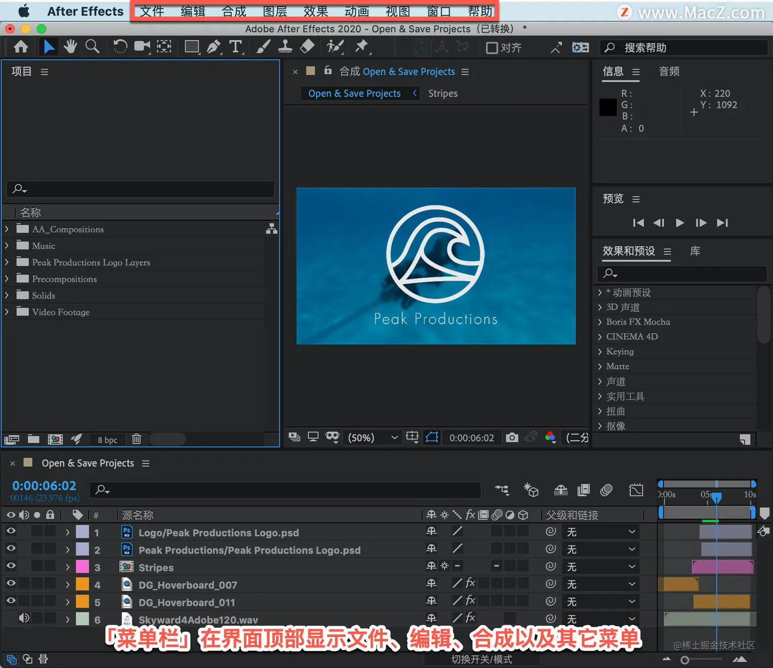 「菜单栏」在界面顶部显示文件、编辑、合成以及其它菜单。在这里可以访问多种指令、调整各类参数以及访问各种面板。