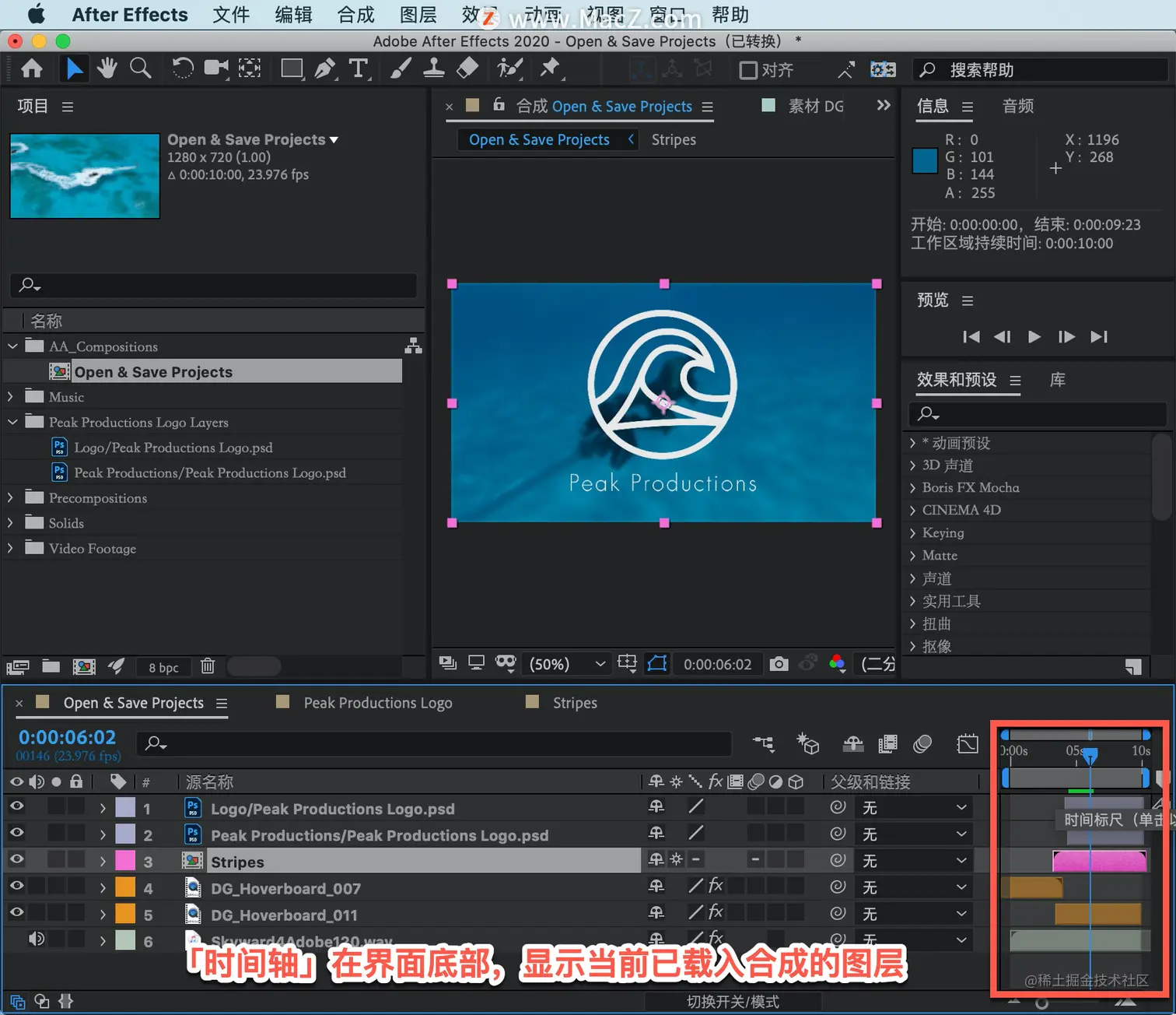 「时间轴」在界面底部,显示当前已载入合成的图层。