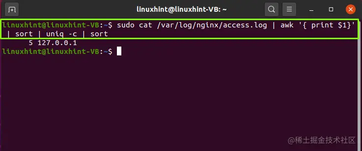 $ sudo cat /var/log/nginx/access.log| awk '{ print 1}' | sort | uniq -c | sort