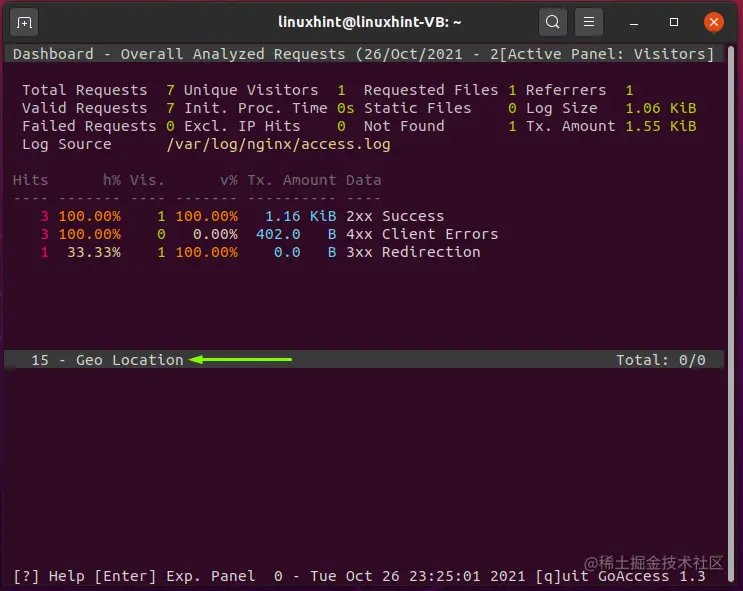 使用Goaccess分析工具:Goaccess包括一个实时监控功能和一个交互式终端查看器。它是用C语言构建的,这就是为什么它速度快,并利用磁盘上的B+Tree数据库逐步处理日志。设计Goaccess分析器工具的目的是提供一些能在终端快速进行日志分析的工具。
