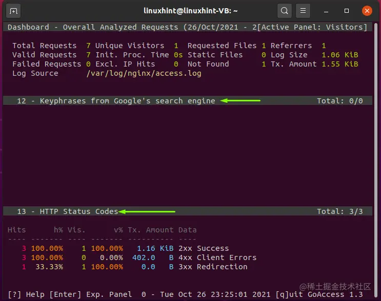 通过Goaccess仪表板向下滚动,查看与推荐人URLs、推荐网站、HTTP状态代码和谷歌搜索引擎的关键短语有关的信息。