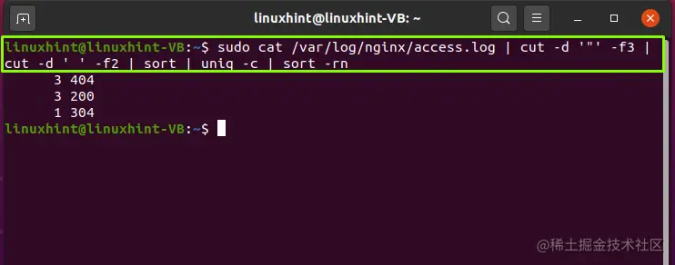 当网站服务器收到一个网站用户的请求时,会返回一个三位数的HTTP响应状态代码。这个代码表示将要发生的事件。例如,"301"响应代码意味着 "永久移动",而 "200"表示 "好的,这是你请求的内容"。你可以解析Nginx的访问日志以获得响应代码。要做到这一点,在Linux终端执行下面的命令。