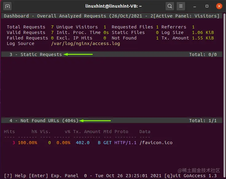 Goaccess还将为您提供有关静态请求、未找到的URL的信息。