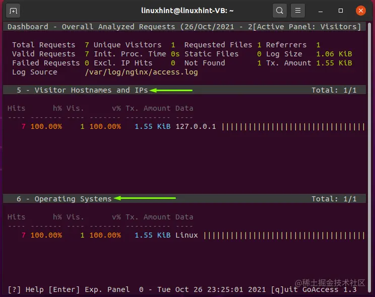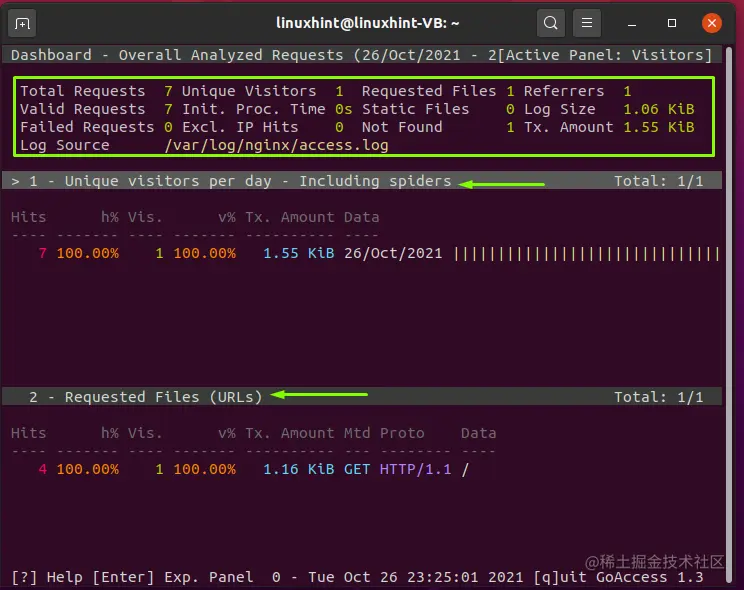 选择日志格式后,你将能够查看Goaccess分析器的仪表板,它将向你显示与每天的独特访问者、要求的文件有关的信息。