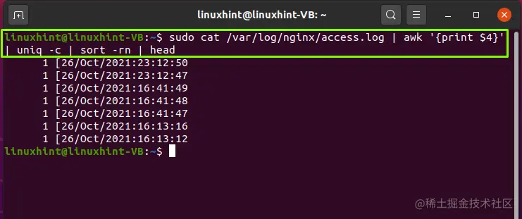 $ sudo cat /var/log/nginx/access.log| awk '{print 4}' | uniq -c | sort -rn | head