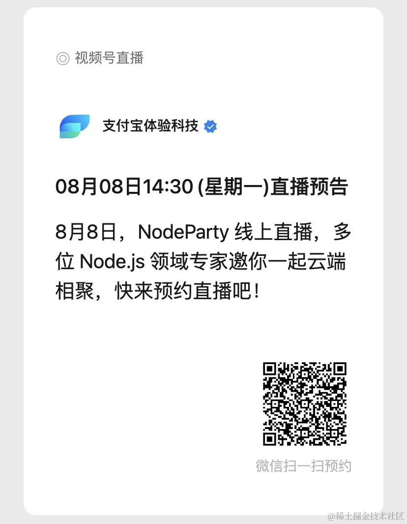 8 月 8 日下午 2 点半,支付宝体验科技将在线举办 NodeParty,多位 Node.js 领域专家将带来精彩主题分享,详细议程即将公布,敬请期待!