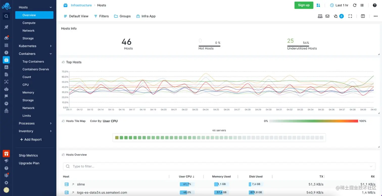 通过在你的环境中作为另一个容器运行的轻量级代理,你可以访问所有的主机和容器指标- 没有盲点。你可以很容易地看到你的Docker主机资源是如何被利用的,容器的资源是如何被利用的,更重要的是,通过自动发现来监控Docker容器内运行的Java应用程序。从你的应用程序中发送日志,并将其与指标一起查看,对其发出警报,所有这些都在一个单一的监控解决方案中。