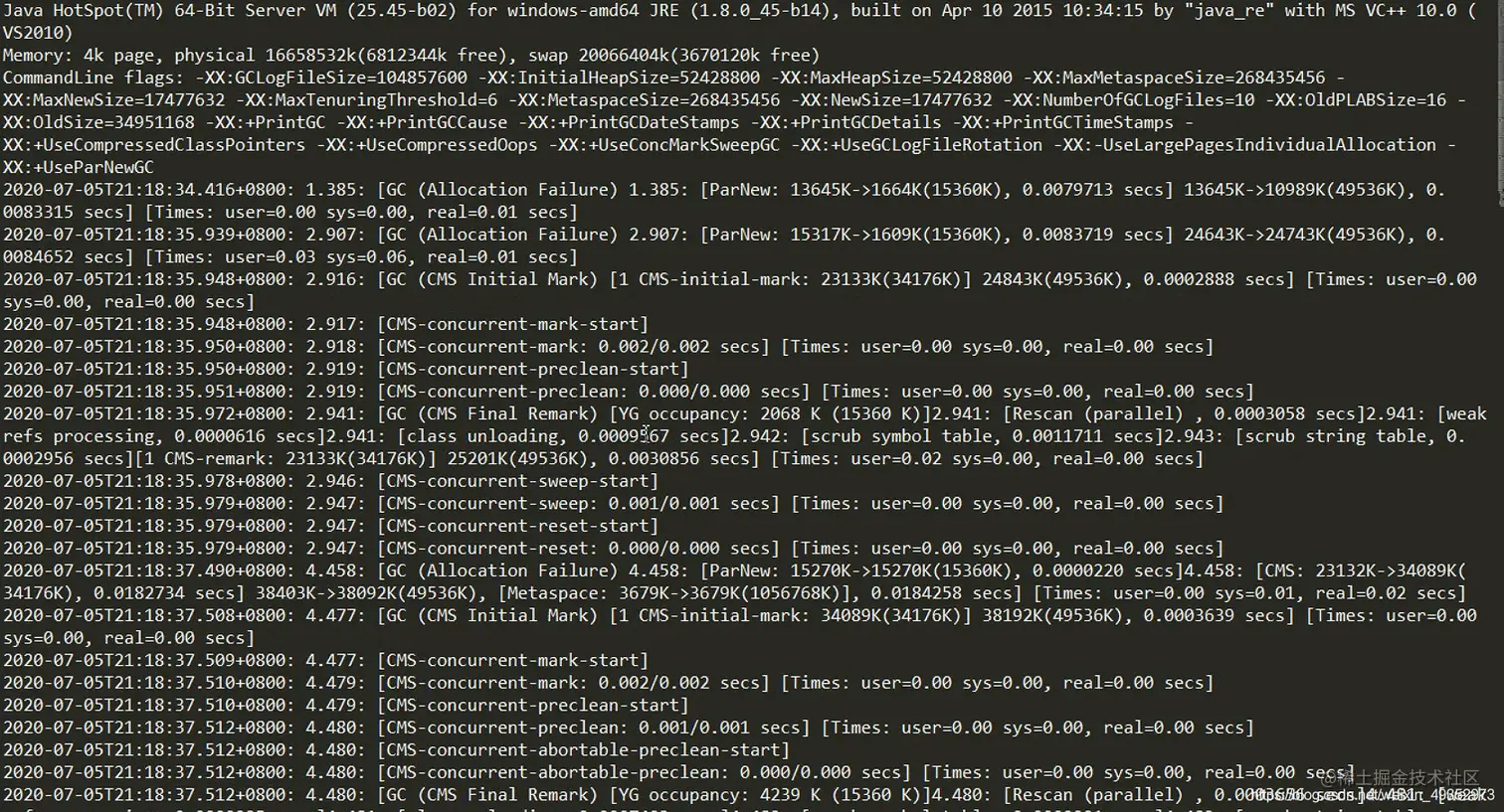 不同的垃圾回收器,打印的 GC 日志也会不同,通过打印 GC 日志,可以发现日志中的垃圾回收步骤和我们上篇文章介绍的不同垃圾回收器回收过程对应(如初始标记->并发标记->重新标记->并发清理->并发重置或使用SerialOld)。