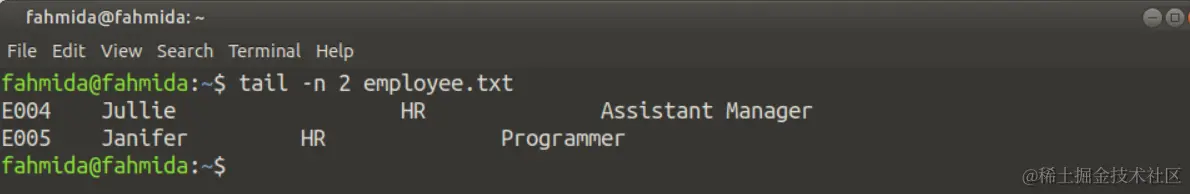 当你想从文件的结尾处读取特定的行时,你必须使用带正值的'-n'选项。下面的命令将显示employee.txt文件的最后两行。