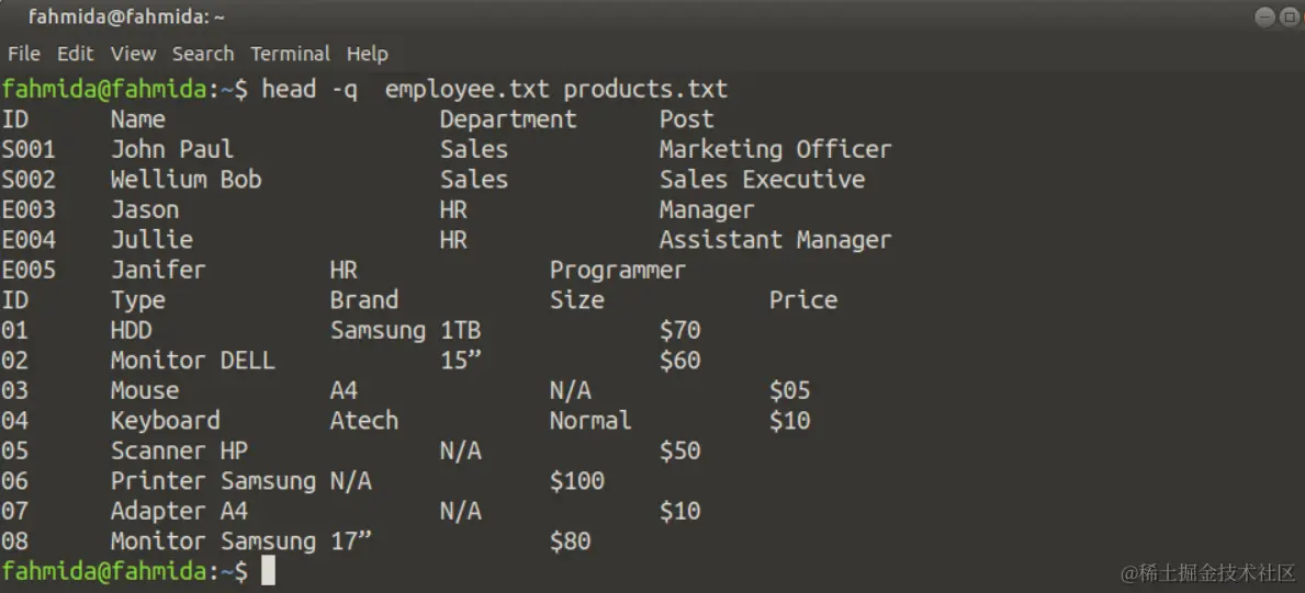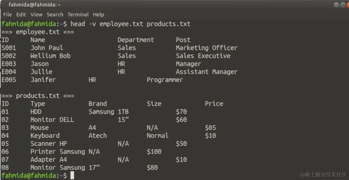 你可以使用任何现有文件或创建任何新文件来测试'head'和'tail'命令的功能。创建两个名为products.txt和employee.txt的文本文件,内容如下,以显示'head'和'tail'命令的使用。