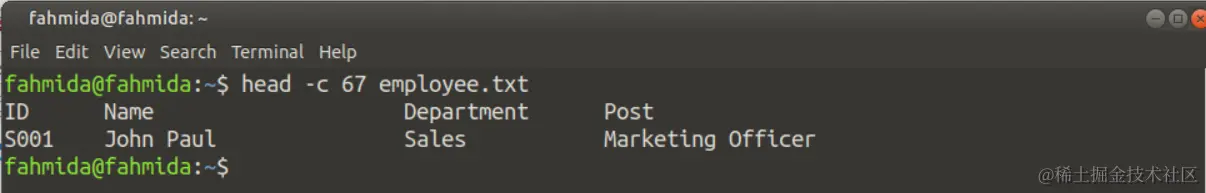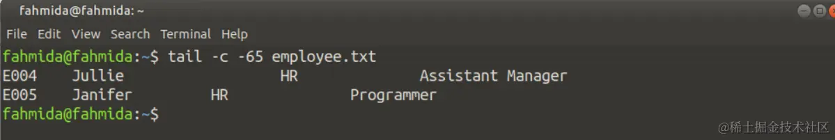 在下面的'tail'命令中,使用了带有65的'-c'选项,在输出中打印出employee.txt文件的最后65个字符。