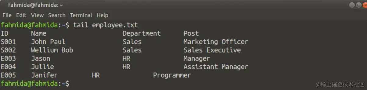 employee.txt文件只有6行,少于10行。因此,下面的命令将显示employee.txt文件的全部内容。