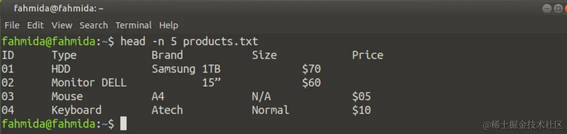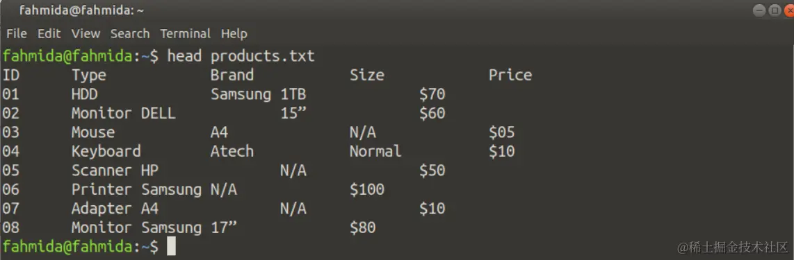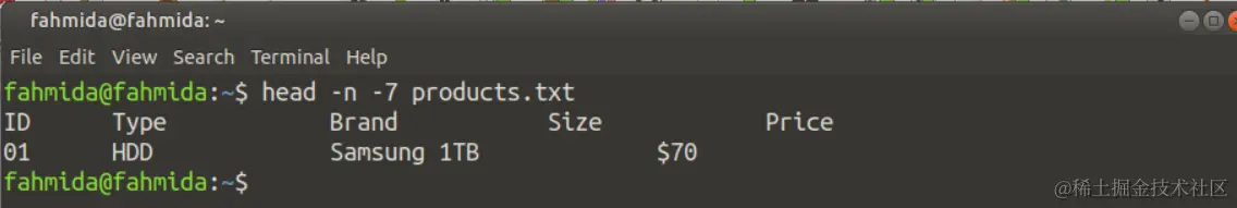 products.txt文件有9行标题。因此,下面的命令将显示product.txt文件的所有行,因为'head'命令中没有使用任何选项。