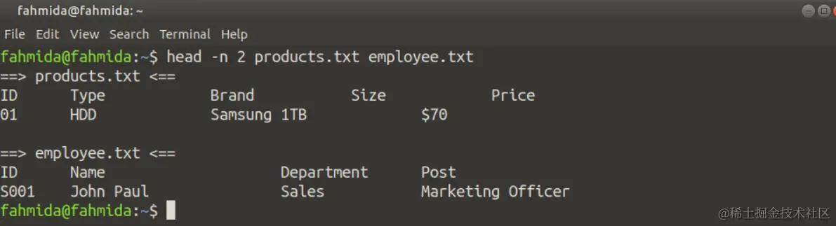 通过使用-n选项和`head`命令中的数字,可以打印一个或多个文件开头的特定行数。下面的命令将打印products.txt和employee.txt文件的前两行。