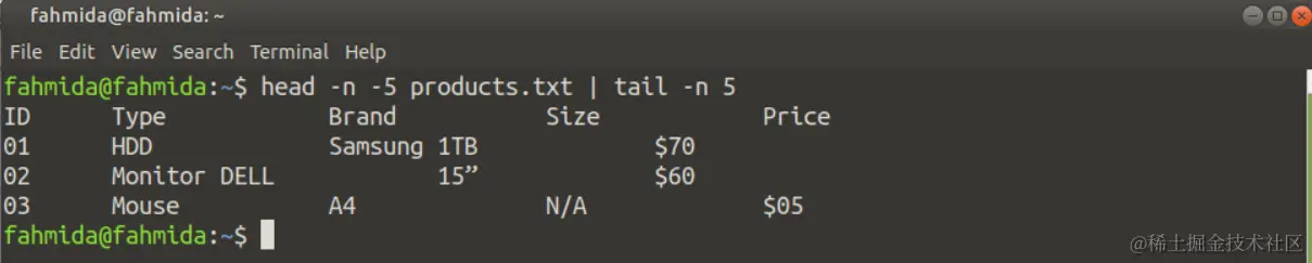 如果你想从任何文件的中间部分读取内容,那么只有**'头**'或'尾'命令不能解决这个问题。你必须同时使用'头'和'尾'命令来解决这个问题。下面的命令将读取product.txt文件的第2至6行。首先,**'head'命令将检索前6行,省略最后5行的负值,'tail'**命令将从'head'命令的输出中检索最后5行。