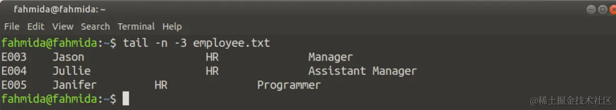 如果你想从开头省略特定的行,那么你必须在'tail'命令中使用带负值的'-n'选项。下面的命令将显示employee.txt文件的内容,省略了开头的3行。