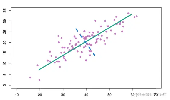 它有2个部分,绿色和蓝色的线。你可以看到绿线上的点 绿色线具有高方差和高相关性,但 蓝色线与绿线的相关性不高,它代表另一个成分。这2条线是我们的点的主成分,我们可以选择其中之一,以降低维度。