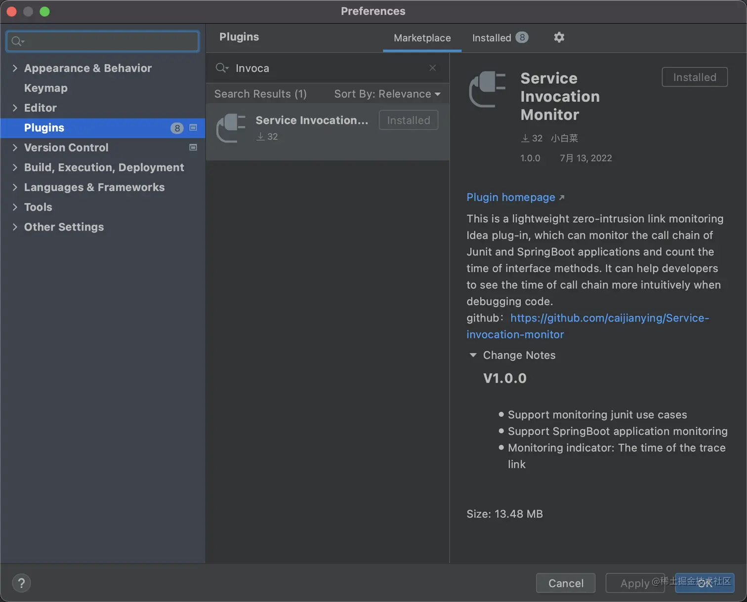 好消息好消息,好消息就是,2022年7月13日,这款插件它终于诞生了。它叫 Service Invocation Monitor。这是一款轻量级的0侵入式链路监控的Idea插件,基本实现原理是采用javaagent技术,将探针嵌入到Idea插件中,赋予了此插件探针的能力。