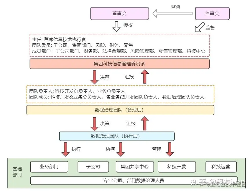 企业数据治理体系除了在技术方面的实施架构,还需要管理方面的组织架构支撑。一般在数据治理建设初期,集团会先成立数据治理管理委员会。从上至下由决策层、管理层、执行层构成。决策层决策、管理层制定方案、执行层实施。层级管理、统一协调。