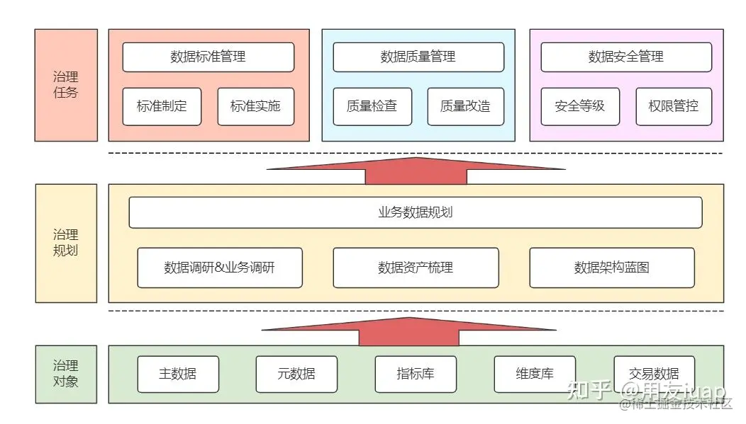企业数据治理体系包括数据质量管理、元数据管理、主数据管理、数据资产管理、数据安全及数据标准等内容。