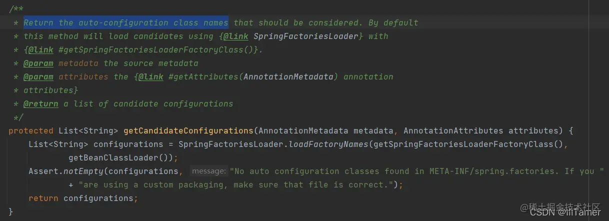 转到对应方法,我们不难在其中发现这样一行所谓 获取候选配置文件——即自动装配默认配置的方法 getCandidateConfigurations。在获取配置之后注册对应的加载事件(fireAutoConfigurationImportEvents)即是全部自动装配 bean 的流程。