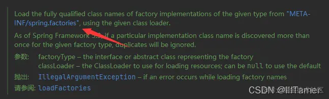 至此,自动装配的逻辑实现便告一段落了,但我们仍有疑问——默认配置类在哪?带着这个疑问,我们点开了 getCandidateConfigurations 方法,发现真正的答案还得去 SpringFactoriesLoader 中寻找: