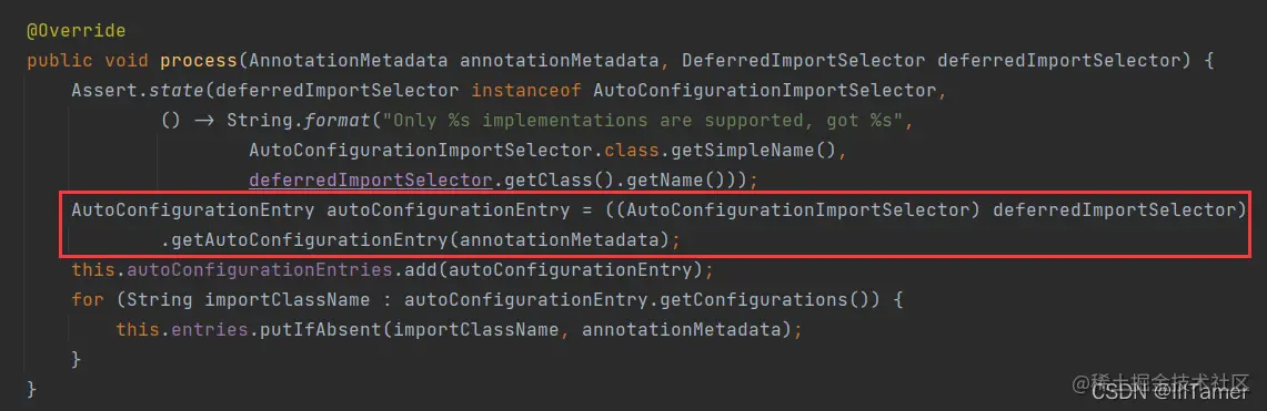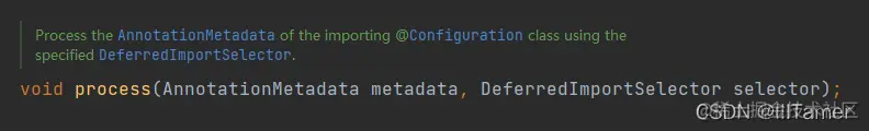 阅读源码,我们不难发现 AutoConfigurationImportSelector#process 这个方法,查看对应的接口方法我们可以得知该方法的作用是处理导入的 @Configuration 标注类的接口元数据(AnnotationMetadata)。那么在这个方法中,理应存在我们要找寻的自动装配的具体实现。