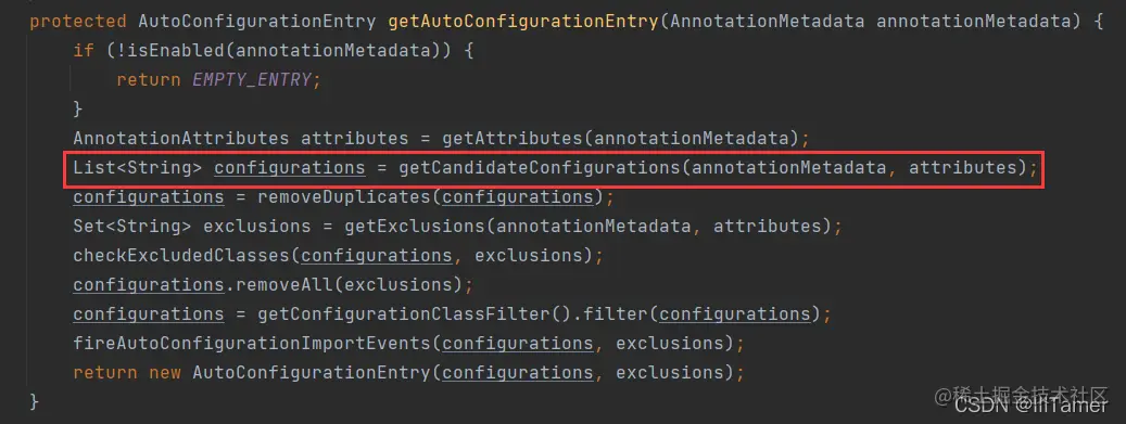 查看实现类方法,我们可以看到以下一行获取自动配置条目(AutoConfigurationEntry)的内部方法: